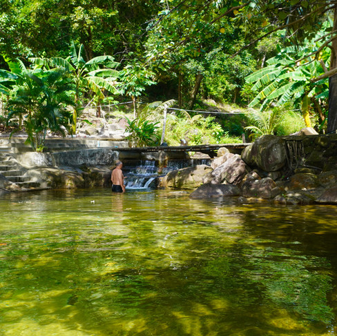 Protégés du soleil par crème et chapeaux, nous marchons vers la cascade : dix minutes pour un site payant, avec un chemin en dénivelé parmi rochers et végétation. La cascade modeste mais agréable invite à barboter ; une piscine rudimentaire au pied propose une eau transparente et sûre, idéale pour nager avec mon fils.